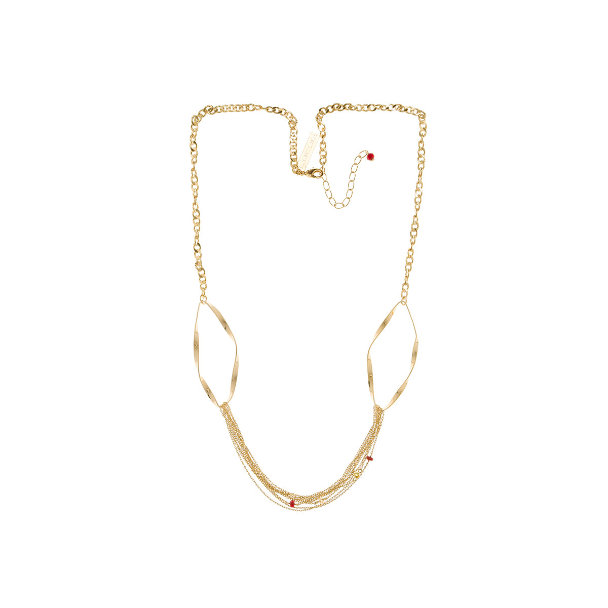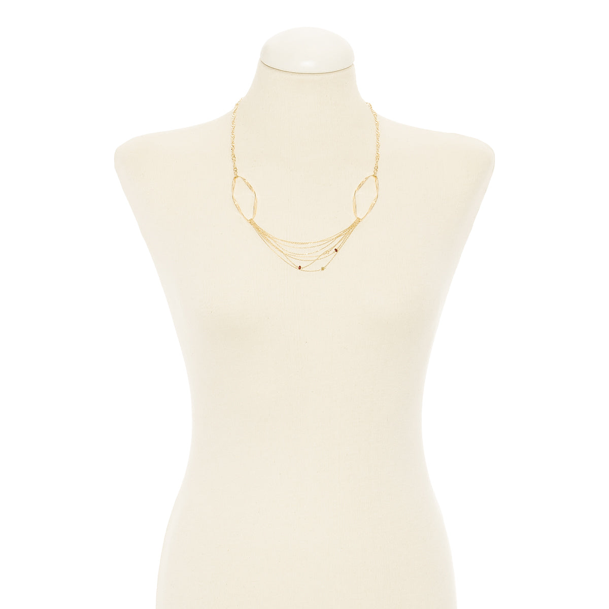 Collar dorado de óvalos calados laterales, entramado de cadena fina con cuentas y extremos de cadena mediana.